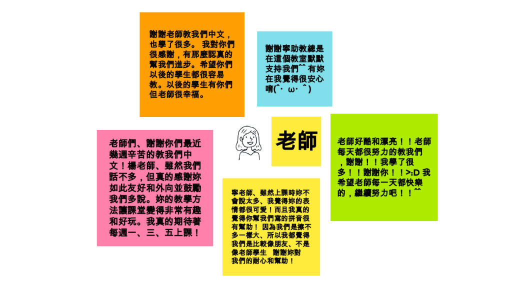 台灣台南人,是一個充滿美食的城市。從2016年開始教中文,喜歡在課堂上和學生們討論各國不同的文化、飲食、生活習慣、旅行的經驗,藉此練習生詞、語法。在我的課堂裡,請勇敢地提問~